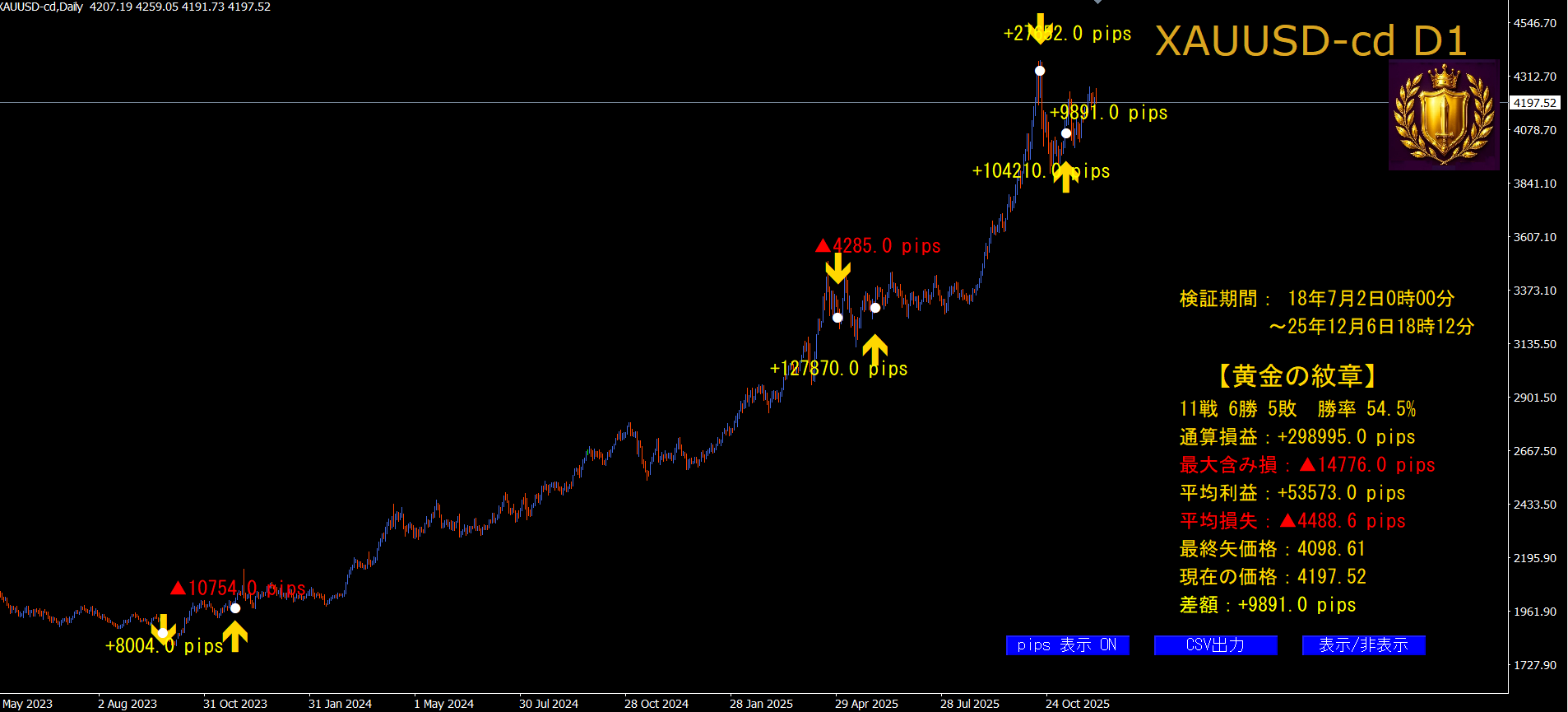 この黄金の紋章には、の過去のトレードの成績をリアルタイムでチャートに表示したり、データーとして簡単に保存しておくことが可能。