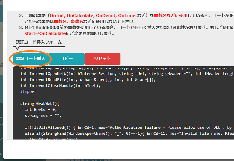 インジケーターとEAでは、認証コードを挿入、または追加する関数が若干異なります。基本的にEAのほうが実装がスムーズに行えることが多いです。